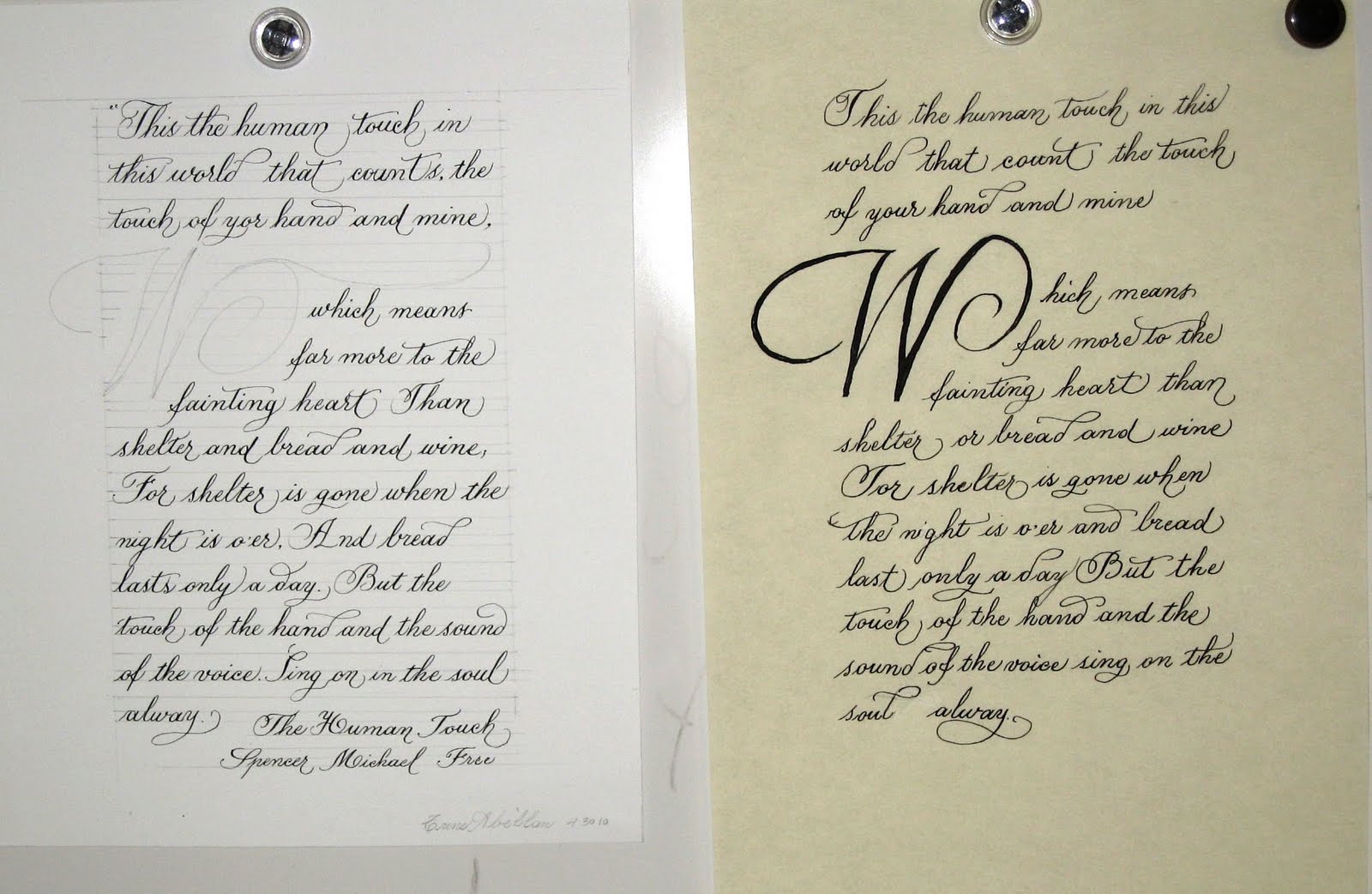 HOMEWORK: Practice writing text for your project. Even if you feel that your works looks bad, write out your text on pergamenata paper. Practice flourishing (see exercise above). DeAnn’s goal is to make you feel comfortable with flourishing.